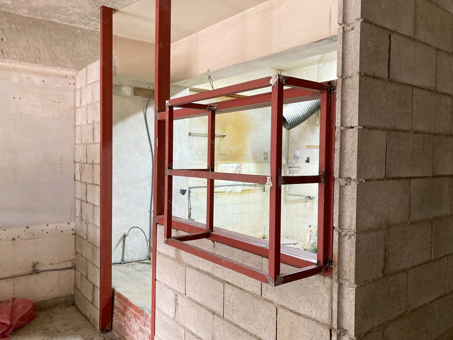 퇴식구, 배식대 부분에는 파이프로 용접을 하여 주방입구 문틀을 만들어 주었고