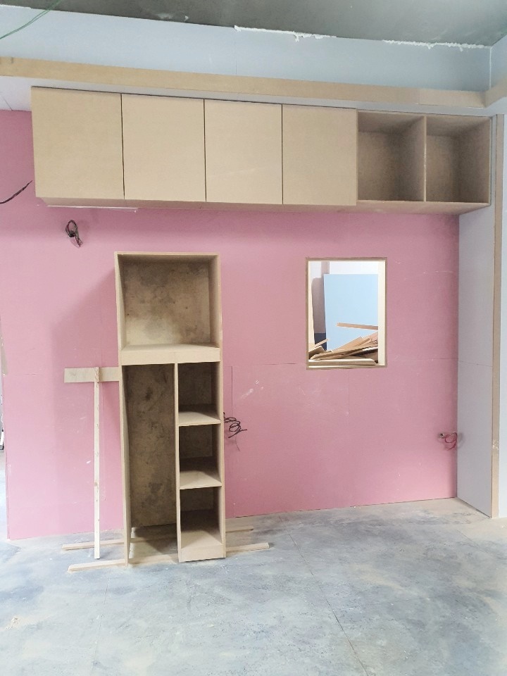 주방 벽면쪽으로는 상부장을 제작해 주었고 필름으로 마감 예정입니다.