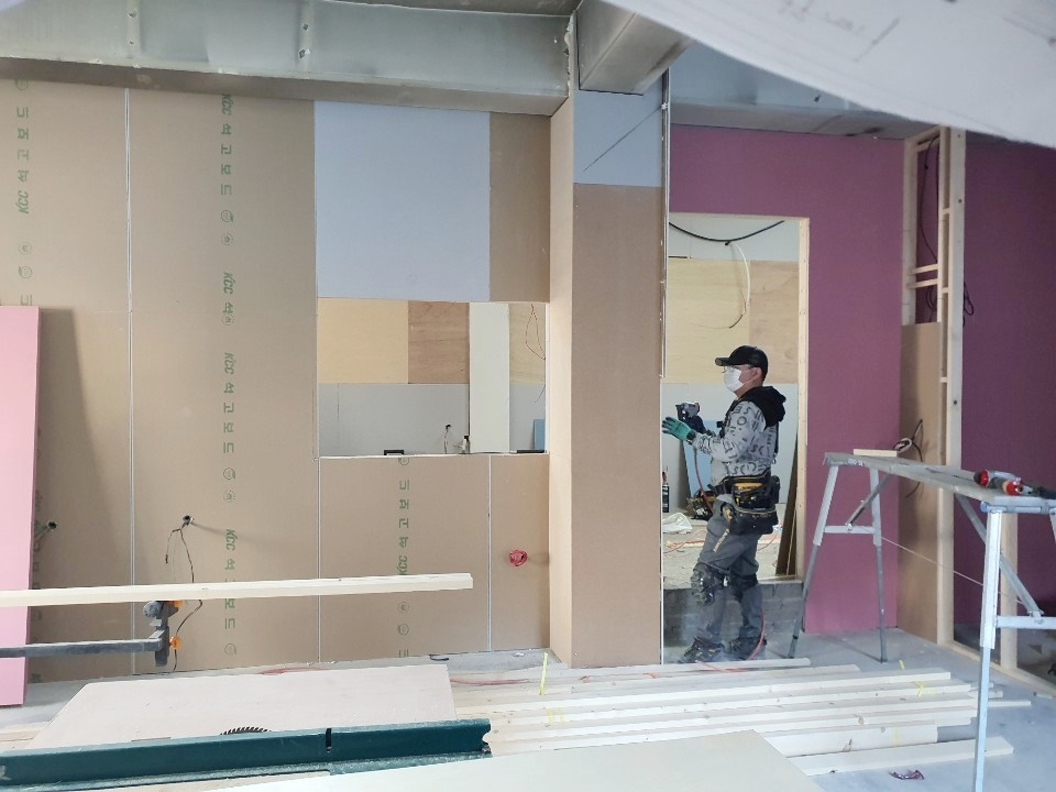 벽면이 고르지 못해 석고보드로 벽면을 쳐주었고 주방벽면은 방수석고로 작업을 해주었습니다.