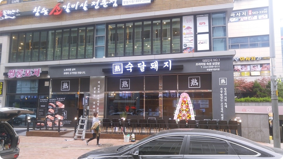 양쪽에 숙달돼지 채널간판을 사용하여서 가게가 잘보이도록 디자인을 해주었습니다.